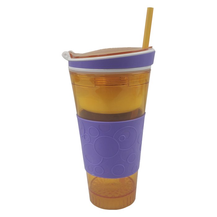 Capacidade de 500ml para bebidas e um pote acoplado com 200ml para lanches (frutas, biscoitos, etc).