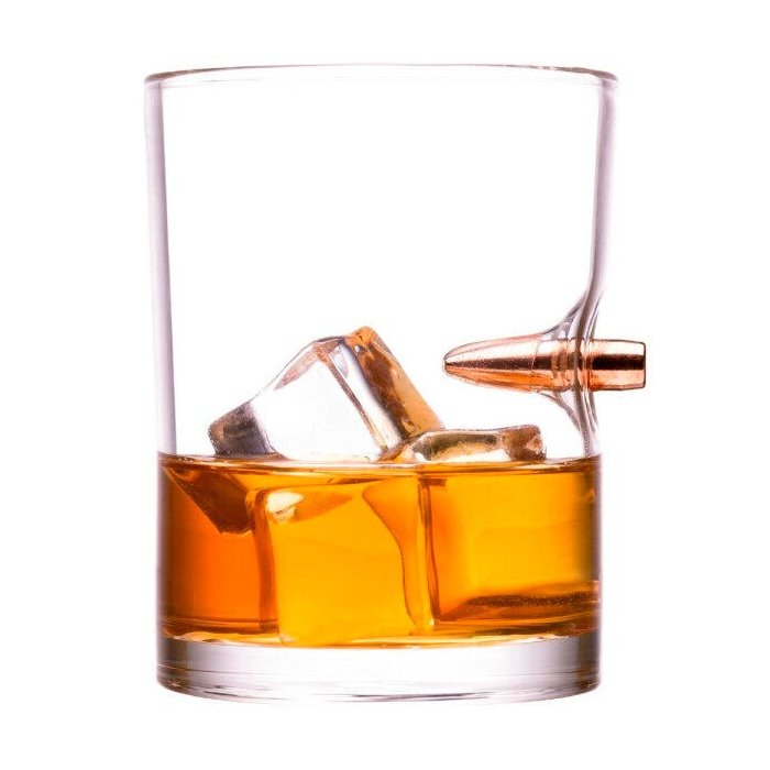 Esse copo tem uma bala cravada na lateral, uma maneira bem criativa de apreciar seu whisky e outras bebidas.