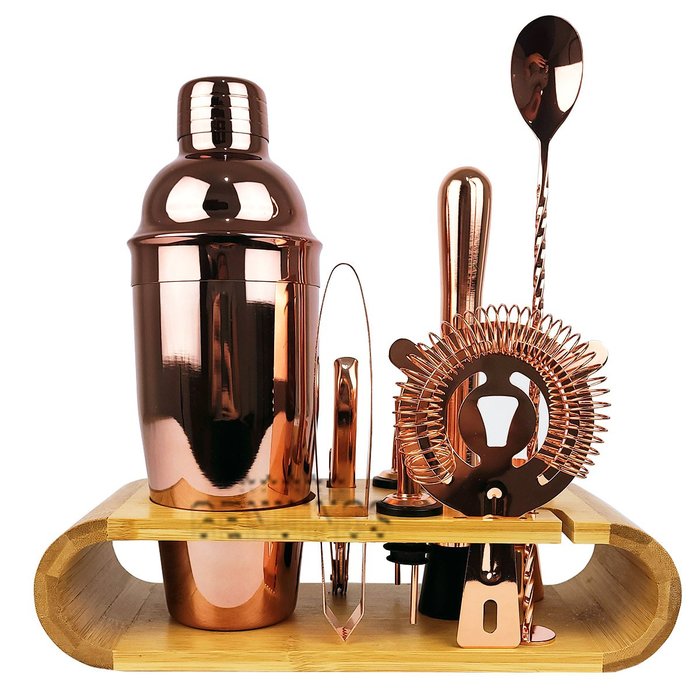 Coqueteleira Profissional Rose Gold com Acessórios em Aço Inox 750ml Kit Barman Base em Madeira Rose Gold