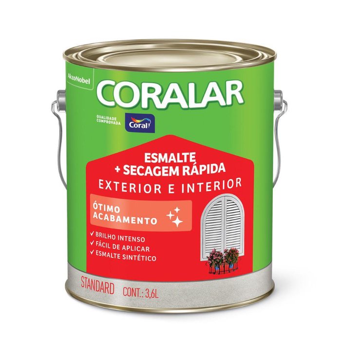 Características Técnicas da Coral Coralar Esmalte Brilhante:- Acabamento: Brilhante- Rendimento: até 50m2 por embalagem- Tempo de Secagem: Ao toque: 4h a 6h; Entre demãos: 8h e Final: 14h a 18h- Demãos: 2 demãos- Diluição: máximo de 10% de diluição com Aguarrás Coral—---------------------------------------------------------------------------------------------------------------------Dicas para o uso correto da Coral Coralar Esmalte Brilhante:- Aplicação: utilize rolo de espuma ou pistola e pincel de cerdas macias- Recomendações: durante a preparação, aplicação e secagem do produto, mantenha o ambiente ventilado. É recomendado usar luvas e óculos de segurança na hora da pintura.- Limpeza: limpe as ferramentas com água e sabão- Armazenamento: conserve a embalagem bem fechada, sempre na posição vertical, em local coberto, longe de fontes de calor e umidade."Coral Coralar Esmalte Brilhante 3,6L