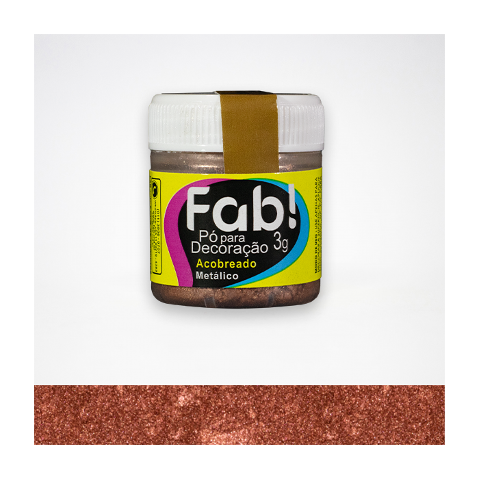 O pó para decoração acobreado faz parte da linha de metálicos da Fab! bastante utilizado para decoração de jóias comestíveis, pois sua cor faz parecer realista a ouro e jóias antigas. Pode ser aplicado a seco em camadas e superfícies finas, com auxílio de um pincel de cerdas macias. Também pode ser diluído na Solução Alcoólica Neutra da Fab! (desenvolvida especialmente para esse tipo de uso) e utilizada na bombinha ou aerógrafo. É indicado para decorar superfícies finas como chantilly, chantininho, pasta americana, pasta de açúcar, pasta de flores, pasta de feijão, chocolate, biscoitos, glacê real, macarons. Verifique as cores da linha Metálicos: dourado, dourado antigo, dourado egípcio, dourado rosê, prateado.