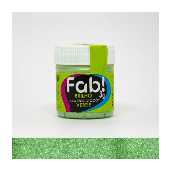O brilho verde faz parte da linha de brilhos da Fab! o que se destaca e prevalece nessa linha são os inúmeros pontos de luz. Diferente dos outras cores verde da Fab! ele traz mais brilho do que cor ao resultado final. Pode ser aplicado à seco em camadas e superfícies finas, com auxílio de um pincel de cerdas macias. Também pode ser diluído na Solução Alcoólica Neutra da Fab! (desenvolvida especialmente para esse tipo de uso) e utilizada na bombinha/pulverizador ou aerógrafo. É indicado para decorar superfícies finas como chantilly, chantininho, pasta americana, pasta de açúcar, pasta de flores, pasta de feijão, chocolate, biscoitos, glacê real, macarons e etc. Verifique as cores da linha brilho amarelo, azul, rosa, cristal, vermelho.