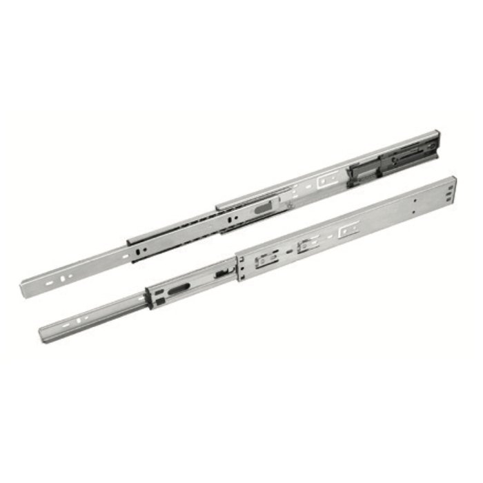 Deslizamento com esferas de aço, peça única de montagem lateral e autotravante no final do curso com travas que permitem a retirada da gaveta.