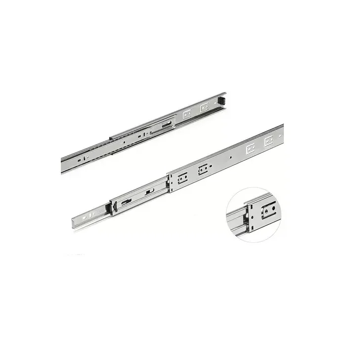 Corrediça telescópica de abertura total e prolongamento de curso em 25 mm do comprimento nominal - deslizamento através de esferas de aço. Peça única de montagem esquerda e direita, com auto travante no final do curso aberto e travas no final do curso que permitem a retirada da gaveta.
