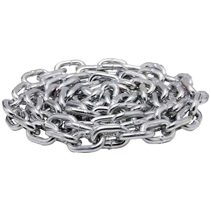 As correntes são feitas de aço carbono galvanizado, que recebe um revestimento de zinco aplicado por imersão a quente. Esse revestimento protege o material contra corrosão, tornando-o resistente em ambientes úmidos ou expostos ao tempo. Além disso, os elos são soldados, o que aumenta a resistência mecânica da corrente, permitindo que suporte cargas pesadas com segurança e durabilidade.