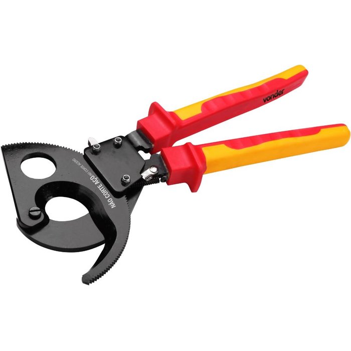Marca: Vonder Conteúdo da embalagem: 1 Cortador de cabos de cobre e alumínio. Destaques e diferenciais:Atende a norma internacional EN/IEC 60900:2004. Possui cabo isolado para 1.000 V, testado individualmente, com abas de proteção que oferecem melhor manuseio. Dicas de uso:Indicado para cortar cabos de até 250 mm². Utilizar apenas para cortar cabos de cobre/alumínio, nunca para cortar arames ou cabos de aço. Detalhes Técnicos:Capacidade de corte em alumínio: 250 mm² Capacidade de corte em cobre: 250 mm² Material da lâmina: Aço especial Material do cabo do cortador de cabos: Aço cromo vanádio Comprimento total do cortador de cabo: 610 mm Tipo de isolação: Cabo isolado 1.000 V