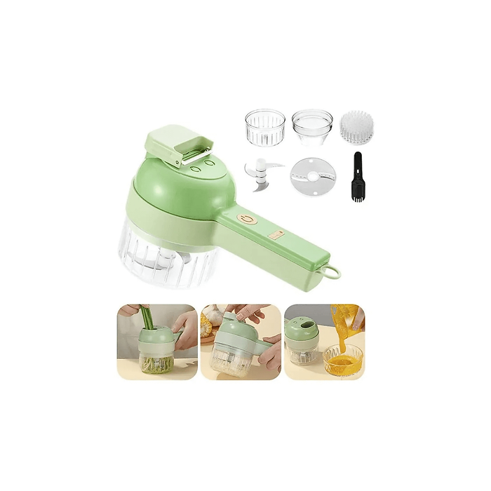 1 x Aparelho cortador de vegetais elétrico portátil1x Lâmina tripla para cortar e triturar1x Lâmina para fatiar1x Escova de limpeza1x Socador com função também de Descascador