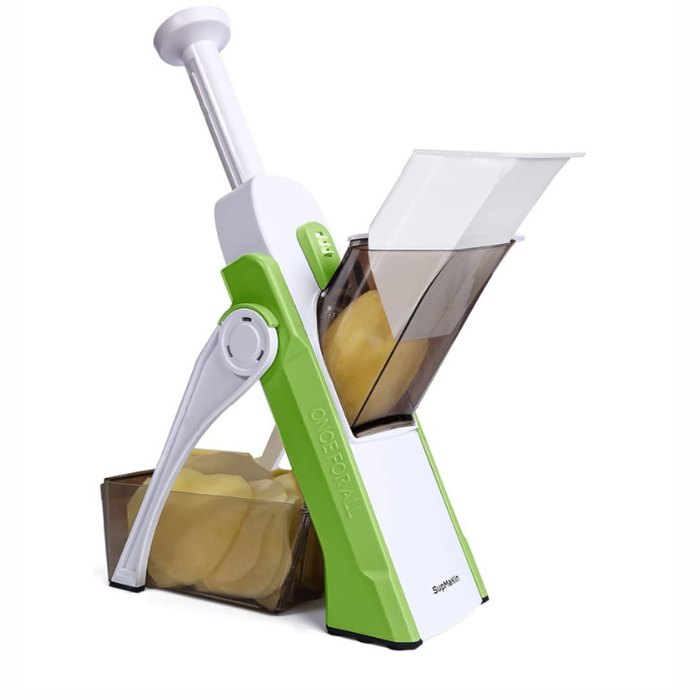 Cortador Fatiador Mandoline Multifuncional com 5 funções para cortar batatas, legumes e vegetais. Feito de plástico e aço inoxidável, este utensílio de cozinha irá facilitar a sua vida!
