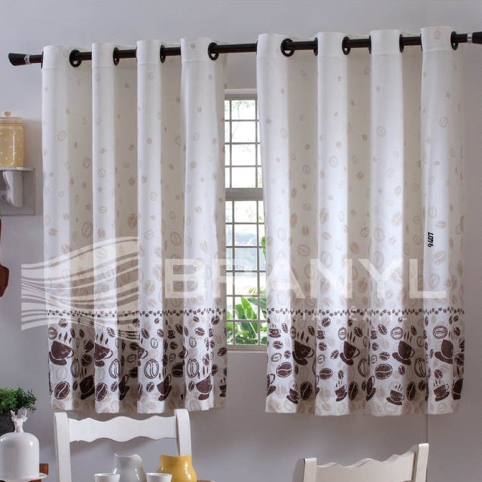Cortina em tecido com estampas de café preto medindo 1,20m X 2,60m indicada para cozinha,possui ilhós.Indicada para varão de até 2,00mts.Embalagem única contendo 2 partes;lavavél ,o detalhe ideal para deixar sua cozinha ainda mais bonita.