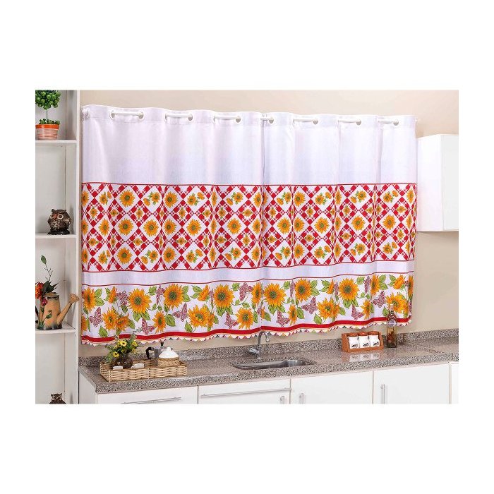 Cortina Cozinha Branca Estampada Girassol 2,40m x 1,40m para Varão de 2 Metros Simples