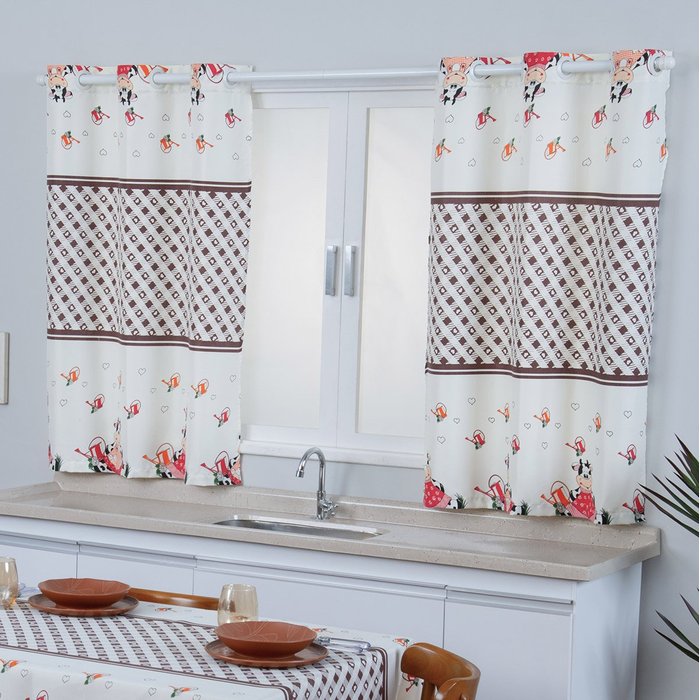 Acrescente estilo e cor para sua cozinha. A cortina de cozinha tem em sua estampa delicados desenhos e é a peça perfeita para completar sua decoração. Com médio nível de luminosidade, leva aconchego e charme para o seu cantinho. Ela possui 2 opões de medida, divididos em duas folhas. Conta também com os ilhóses removíveis no produto, eles permitem a lavagem na máquina.