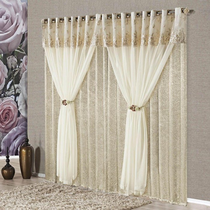 Cortina Nobreza, estilo e designer totalmente sofisticados, trabalhada com tecidos Seda Amassada e Voal ;de altíssima qualidade, cores vivas e brilhante, perfeita para decoração luxo de alto padrão. O Bandó é o todo bordado e as abraçadeiras confeccionadas com pingentes.Contém na embalagem: