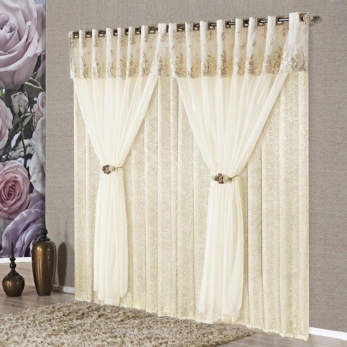 Cortina Nobreza Luxo Para Varão Tecido Seda Amassada E Voal 3,00 X 2,50 Metros - Palha
