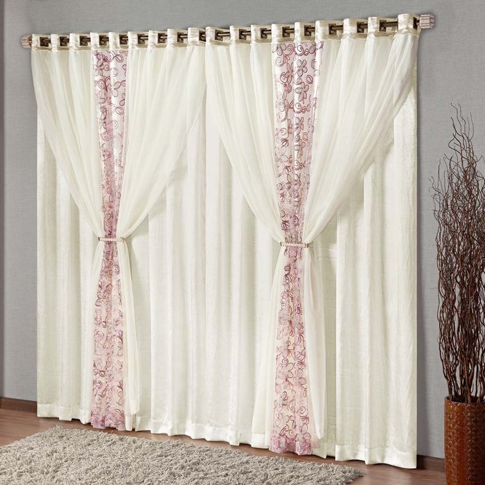 Cortina Topázio Varão Cetim Amassado e Voal Decorado 3,00m x 2,50m - Palha e Rosê