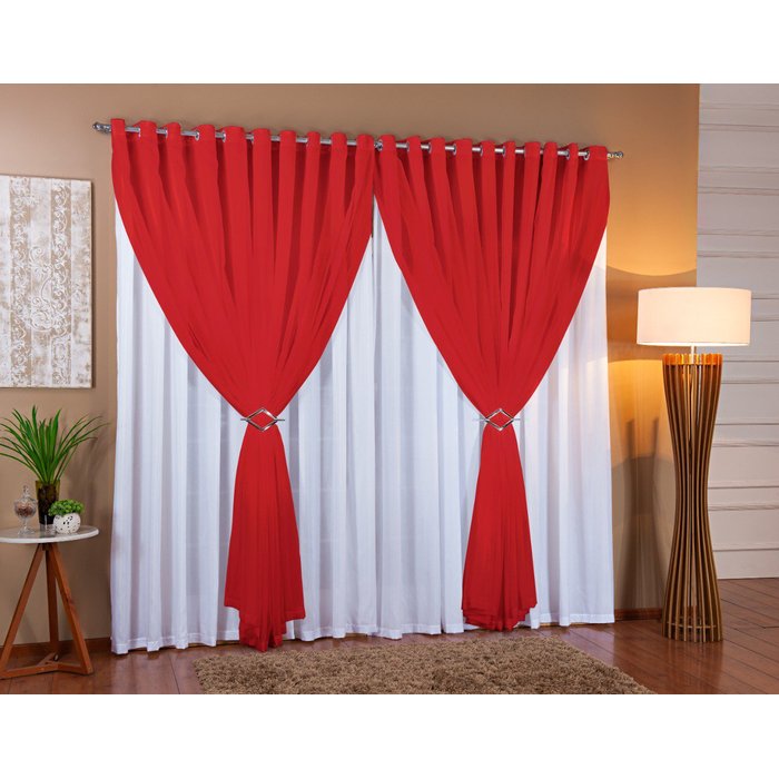 Cortina Voil Com Forro Microfibra Sala E Quarto 6,00x2,80 Branco/Vermelho