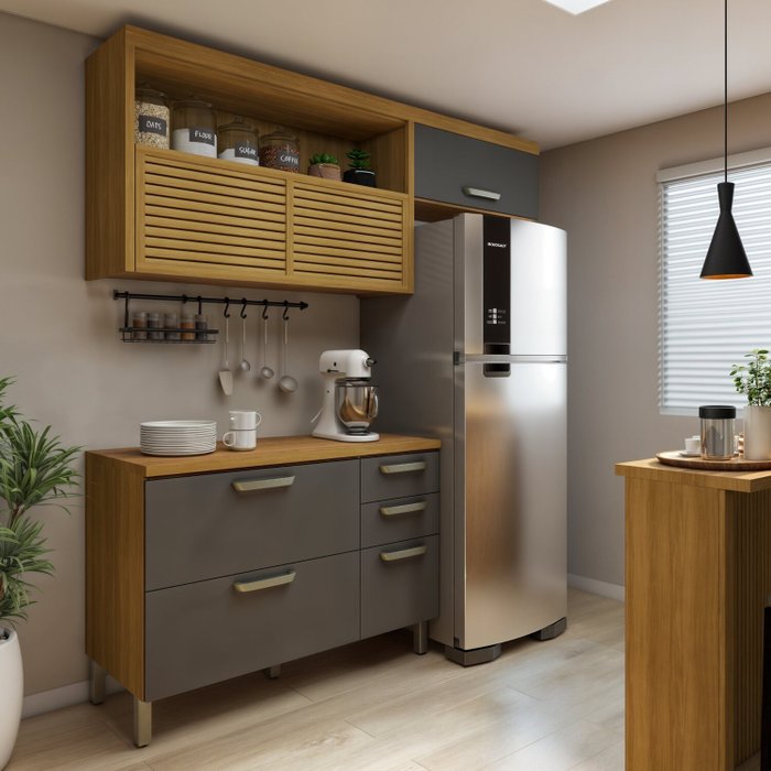 Cozinha 2 Peças Armário Aéreo 2 Portas e Balcão 2 Portas 3 Gavetas Princesa Freijó/Grafite