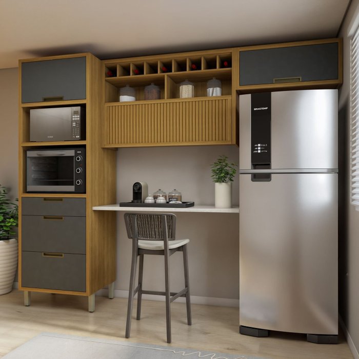 Cozinha 3 Peças Imperatriz Paneleiro Torre 2 Portas 3 Gavetas, Armário Aéreo 1 Porta e Armário Aéreo Geladeira Freijó/Grafite