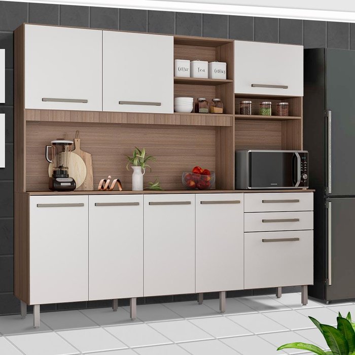 Dimensões do produto: Largura 213 cm; Profundidade Superior 31 cm; Profundidade Inferior 45 cm; Altura 194 cm.Itens Inclusos: 1 cozinha-MDP-Gavetas com corrediças metálicas-Puxadores com design moderno-Espaço para micro-ondas até 38L-Possui pés reguláveis-Amplo espaço internoComplexidade da montagem: Média, pode ser montado por mais de uma pessoa e/ou necessite de maior conhecimento para montagem.Recomendações de uso, manutenção e limpeza: Limpar com flanela ou pano macio seco, não utilizar produtos abrasivos, desengordurantes, álcool ou solvente. Não expor o produto diretamente a luz solar e à umidadeGarantia: 3 mesesOBS: Foto meramente ilustrativa, objetos, utensílios e decoração não fazem parte do produto.