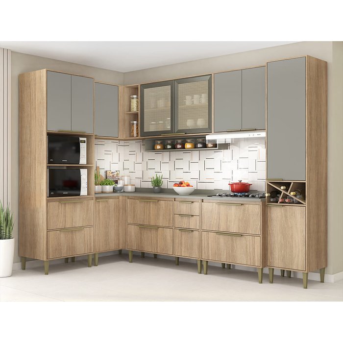 Descrição: A Cozinha BEE01 é o modelo mais completo do mercado! Composta por 8 módulos, incluindo kit forno e micro, paneleiro com adega, balcão para fogão cooktp, balcão de pia com tampo, além de canto superior e inferior. O aéreo de pia possui tela e nicho inferior. A elegância fica por conta das portas embutidas e puxadores alumínio na cor champagne. Os pés de 17cm possuem regulagem de altura. A qualidade é garantida com MDP 15mm acabamento fosco com caixaria na cor Carvalho e frentes na cor Cinza.