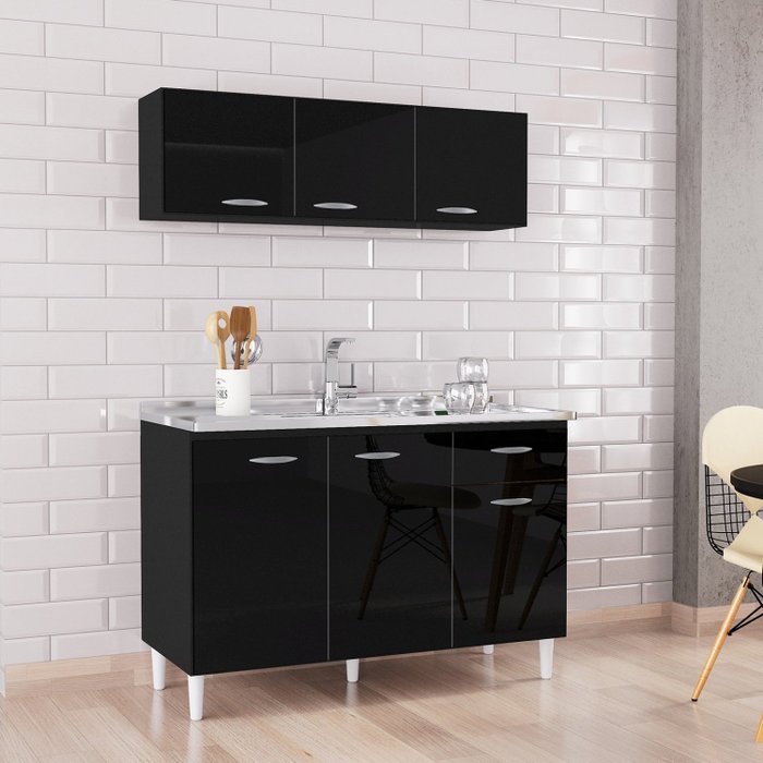 Cozinha Compacta 2 Peças Balcão para Pia 3 Portas 1 Gaveta com Armário Aéreo 3 Portas Preto