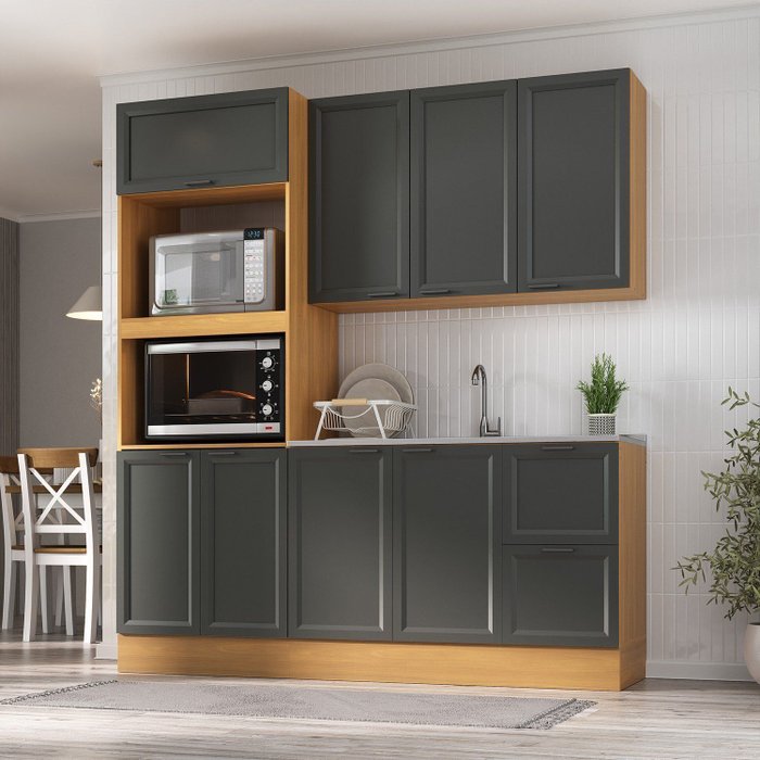 Com amplo espaço interno e gavetas de deslizamento suave graças às corrediças telescópicas, ele é ideal para organizar sua cozinha de forma eficiente. As portas robustas possuem dobradiças reforçadas de 35mm e o armário aéreo com pistão a gás é perfeito para instalação sobre geladeiras ou fogões. Os puxadores em alumínio com pintura epóxi oferecem um toque de design contemporâneo e resistência ao uso diário. Os pés em PVC de 14,5 cm são ajustáveis para maior estabilidade, e os rodapés removíveis facilitam a limpeza do dia a dia.