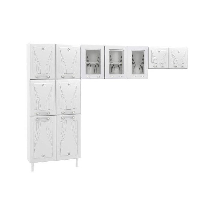 A cozinha Star com 3 vidros, reúne design harmônico e arrojado. Com puxadores de acrílico transparente e apliques resinados de alto brilho a estampa da linha Star agrega elegância e sofisticação à sua casa.