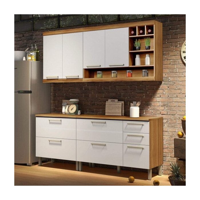 Cozinha Compacta 4 Peças Burguesa Nesher Móveis Amadeirado Freijó/Branco Brilho