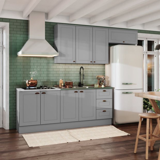 Cozinha Compacta Emily 4 Peças 2.205mm de Altura, 2.715mm de Largura e 510mm de Profundidade. Um novo conceito inspirado nas clássicas cozinhas estilo americano, seu design contemporâneo embeleza qualquer ambiente. Projetado para proporcionar praticidade e funcionalidade ao uso. Produto 100% MDF, disponibiliza de várias opções de módulos que possibilitam diversas composições lineares, possui detalhes usinados em baixo relevo nas portas e gavetas, puxadores nos balcões em formato de concha e nos aéreos são pontuais, ambos na cor ouro velho, possui dobradiças de 35mm com amortecimento, aéreos com 830mm de alturas, gavetas com corrediças telescópicas proporcionando maior abertura. A sua instalação pode ser feita tanto com o uso dos rodapés ou suspensa.
