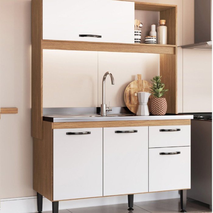 A cozinha compacta Katy é um produto com excelente qualidade, produzido em MDP de fácil montagem, portas fixadas com dobradiças metálicas e gavetas com corrediças metálicas, facilitando a organização dos seus utensílios em geral, possui também pés com regulagem de altura deixando assim sua casa com um ambiente mais moderno e aconchegante.