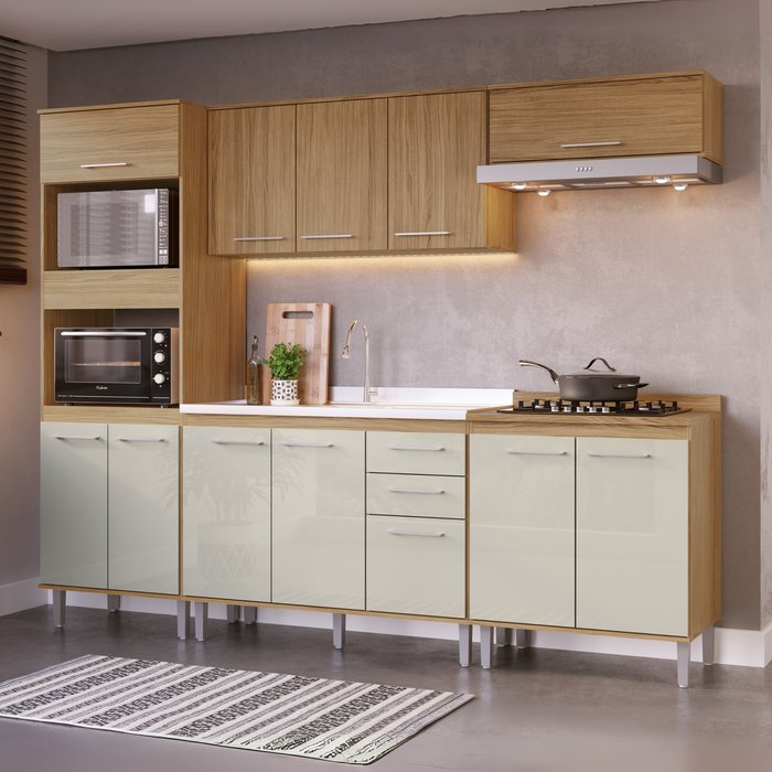 Cozinha Compacta 5 peças com 1 Paneleiro Torre Quente, 2 Balcões e 2 Armários Aéreos Gaia Naturalle/Cristalo