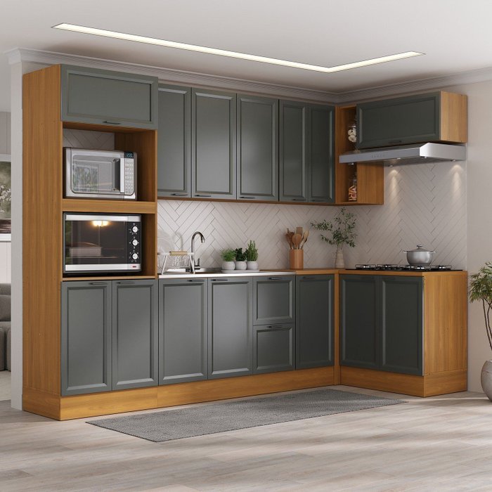 | Informações Complementares (Novo) | Portas de bater almofadadas/molduradas em MDF; balcão 80cm e balcão canto com tampo de 27mm de espessura; balcão 120cm sem tampo ideal para pia que atenda a medida de 120x50cm; aéreo canto e balcão canto reversíveis direita/esquerda; corrediças telescópic |