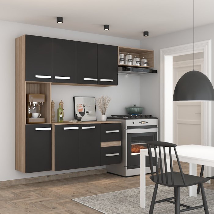 Cozinha Compacta 7 Portas 2 Gavetas Suspensa Armário e Balcão Anita Teka/grafite - Pnr Móveis Preto