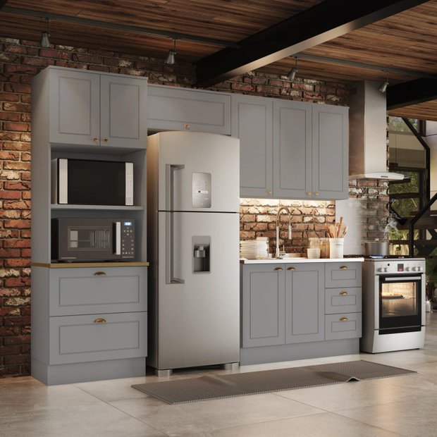 Cozinha Compacta 8 Portas 5 Gavetas Peças Emily Cinza/Nature