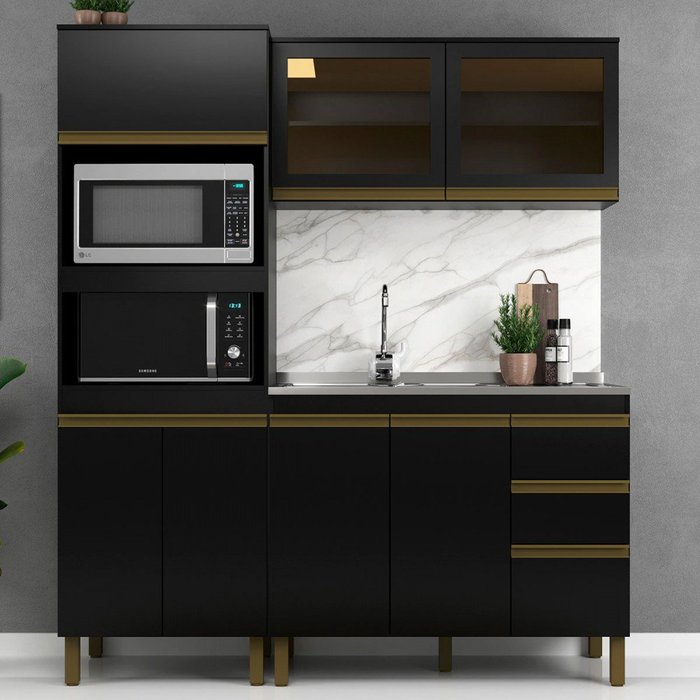 Cozinha Compacta Cecília 7 Portas 3 Gavetas com Vidro Preto - Jcarvalho Preto