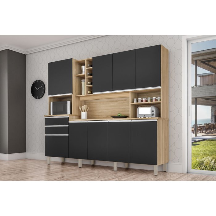 Cozinha Compacta com Armários, Balcões, Nichos e Adega Barcelona Nature com Preto