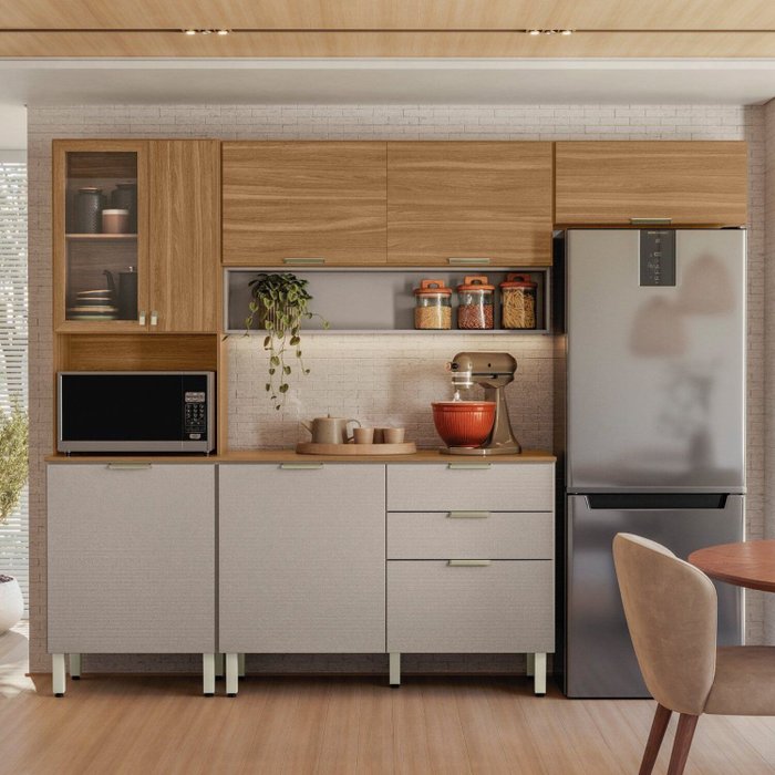 Excelente capacidade de armazenamento. No paneleiro e armários aéreos têm nichos para forno microondas e itens que desejar ter fácil acesso. Balcão para maximizar o espaço de armazenamento da cozinha e apoio no preparo de alimentos e ter uma experiência completa.