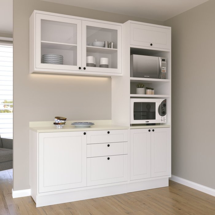 A Cozinha Compacta Com Vidro 3 Peças Sevilha é composta por peças essenciais para sua cozinha. Com estilo moderno e sofisticado, agrega beleza ao ambiente. Todos os puxadores são metálicos e pontuais e as dobradiças possuem amortecimento, de forma que proporcione resistência e funcionalidade ao produto. A Cozinha é produzida 100% em MDF, além de possuir corrediças telescópicas nas gavetas que proporcionam maior abertura e um deslizamento suave e silencioso. Acompanha o tampo em MDF.