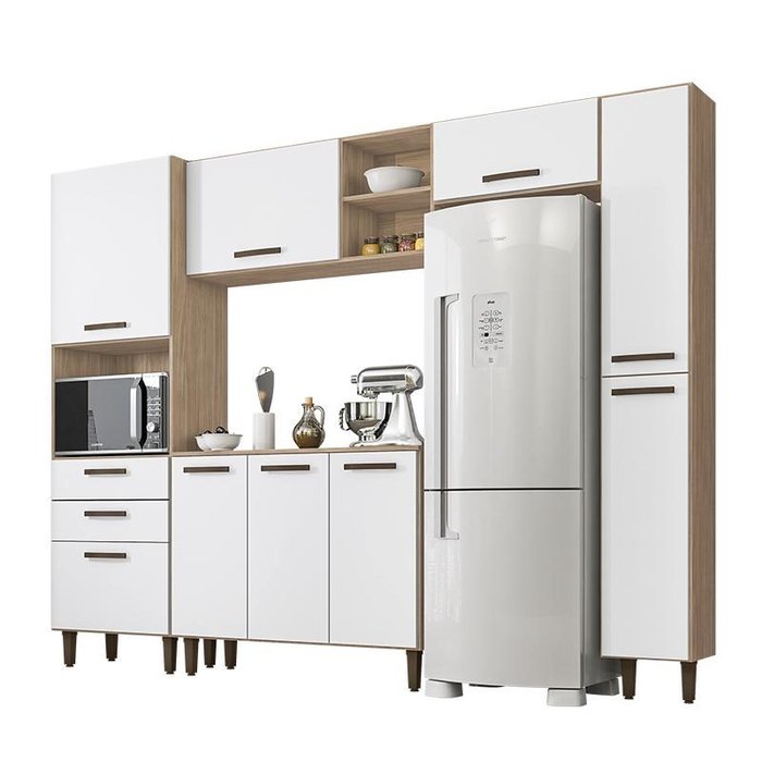 Esse modelo é composto por armários e gavetas que oferecem espaço suficiente para armazenar utensílios de cozinha e eletrodomésticos.