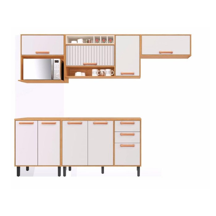 Esse modelo é composto por armários, gavetas, prateleiras, balcão e pia, oferecendo tudo o que é necessário para equipar a cozinha.