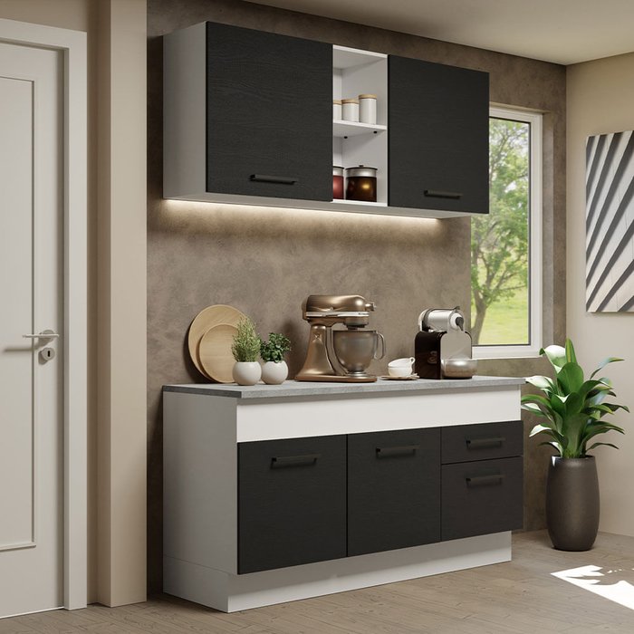 Esse modelo é composto por armários, prateleiras e um balcão que pode ser utilizado para preparar alimentos, além de oferecer espaço para refeições rápidas.