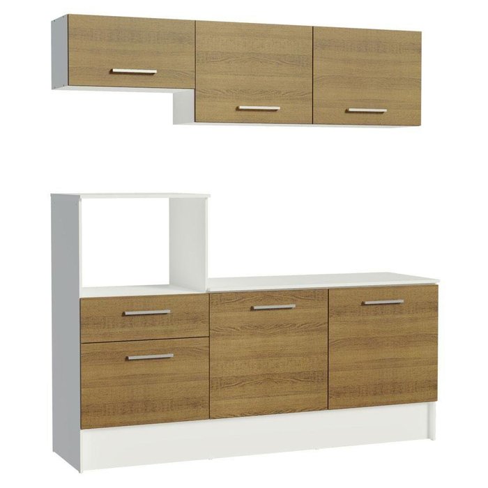 - Itens inclusos: Um (1) Balcão com três (3) portas, uma (1) gaveta e nicho para forno; Um (1) Armário Aéreo com três (3) portas
