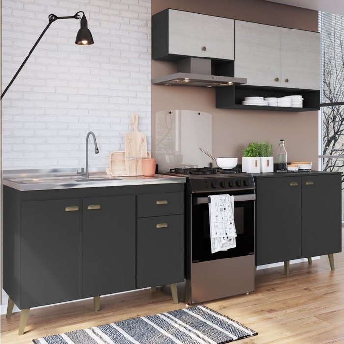 Cozinha Completa 3 Peças 8 Portas 1 Gaveta 1 Nicho Porta Tempero Atena Grafite/Snow