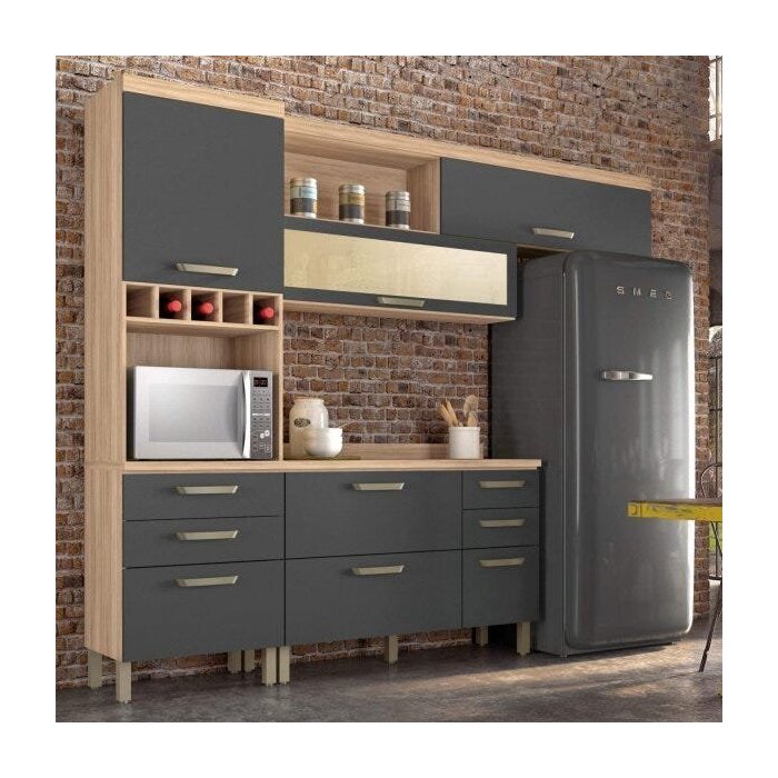 Cozinha Completa 3 Peças com Balcão e Tampo Condessa Nesher Móveis Grafite/Madeirado