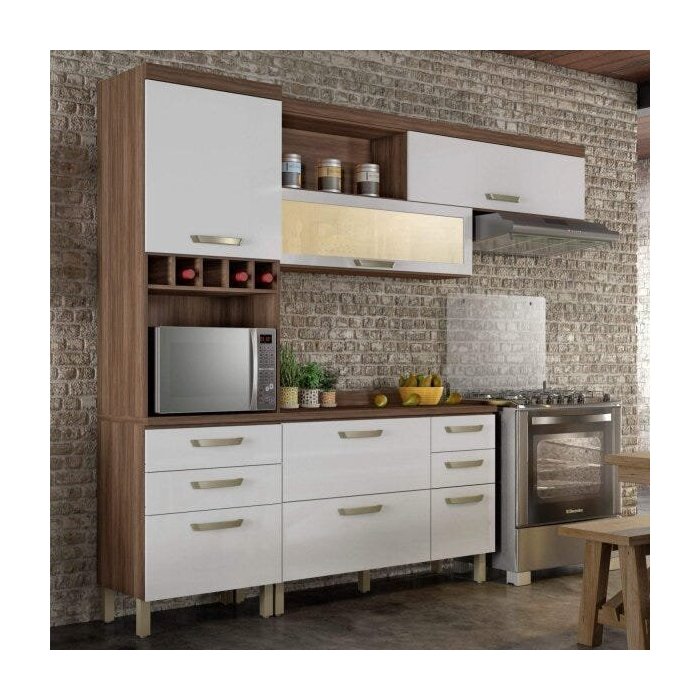Cozinha Completa 3 Peças com Balcão e Tampo Condessa Nesher Móveis Branco/Madeirado