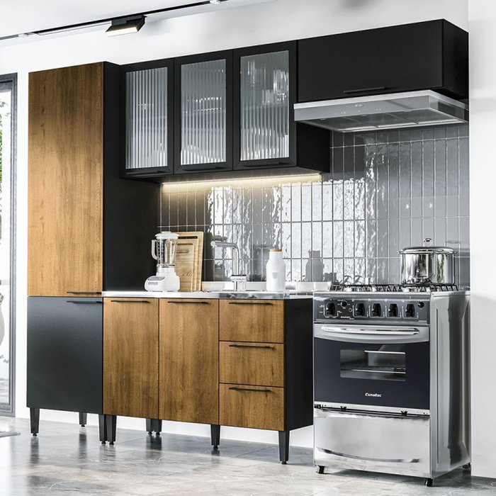Cozinha Completa 4 Módulos 8 Portas 3 Gavetas Canelone Preto/Alamo