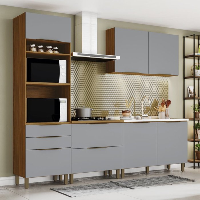 Cozinha Completa 4 Peças Torre Quente e Coifa Bea Espresso Móveis Nature/Cinza