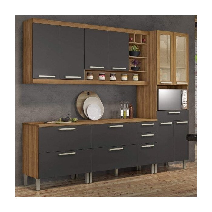 Cozinha Completa 5 Peças Burguesa Nesher Móveis Amadeirado Freijó/Grafite Semi-Brilho