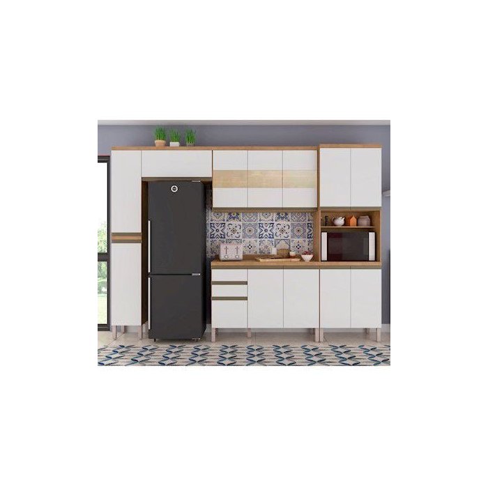 Este modelo de cozinha além de dar toda elegância, ajuda na organização do seu ambiente por possuir dez portas, três gavetas com corrediças telescópicas, dez prateleiras, paneleiro com espaço para Microondas, aéreo triplo com vidro reflecta, puxadores em perfil bronze o que te da mais espaço para manter seus objetos organizados.