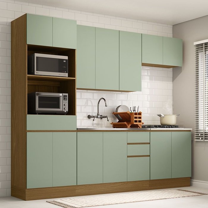Cozinha Completa 5 Peças com Espaços para Micro-ondas e Tampo 270 Cm Slim Luciane Móveis Freijó/verde Jade