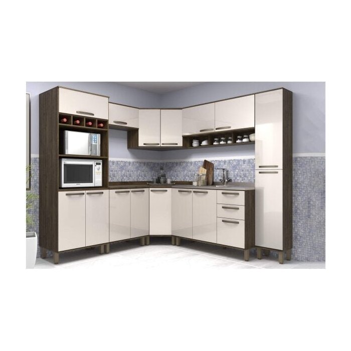 Cozinha Completa 8 Peças com Canto e Balcão para Pia Sara Espresso Móveis Pérola Off